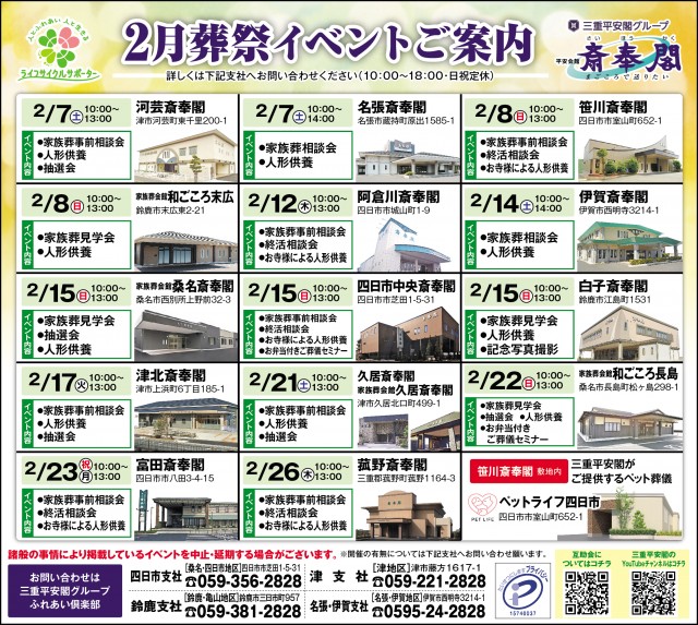 斎奉閣、家族葬会館和ごころでは毎月個別相談会を開催しています。人形供養や写真撮影会、抽選会など。 ぜひお気軽にご来館ください。 お問い合わせはお近くのふれあい倶楽部各支社へご連絡ください。